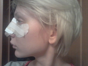 это мое фото уже на шестой день после операции. вчера сменили повязку. впервые увидела свой новый носик. =) через 4 дня очередной прием, а уже через неделю снимут гипс!